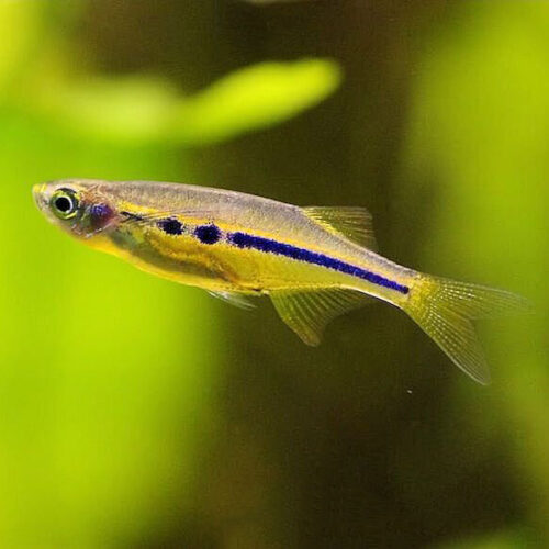 w warunkach naturalnych może być nieco większy. Ciało ryby jest srebrno- złote, w zależności od pochodzenia i cech osobniczych z przewagą jednego z tych kolorów. Cechą charakterystyczną jest intensywnie niebieski pasek ciągnący się wzdłuż linii bocznej od pokryw skrzelowych aż do nasady ogona. U niektórych ryb pasek przybiera miejscami postać okrągłych niebieskich plam. Płetwy przejrzyste w odcieniu ciała. Samce są smuklejsze i trochę mniejsze od samic.